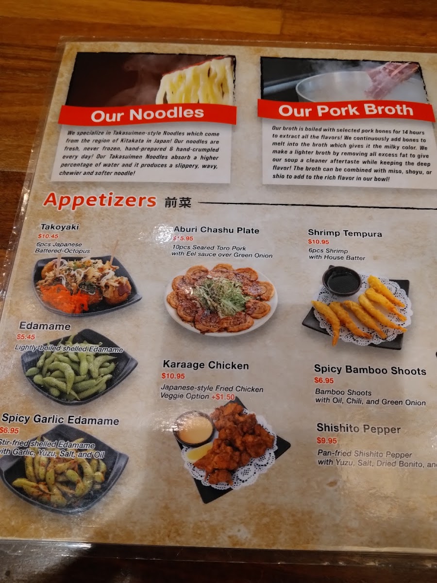 Pork broth, shoyu base, pork back fat, black garlic oil, Toro chashu(5), green onion, dried seaweed, bamboo shoot.